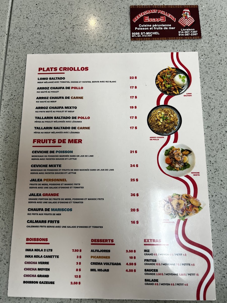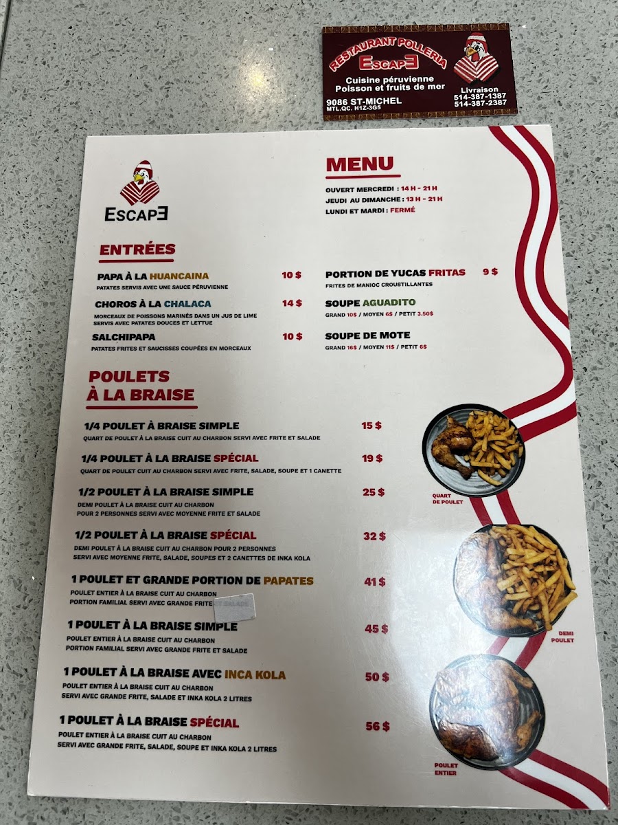 Welcome to Restaurant Escape, a hidden gem located at 9086 Bd Saint-Michel, Montreal. This cozy eatery captures the essence of authentic Peruvian cuisine, renowned for its mouthwatering pollo a la brasa. As Bryce MacDonald aptly noted, it's a simple place where the atmosphere feels like home—filled with the vibrant sounds of Spanish chatter and soccer games.